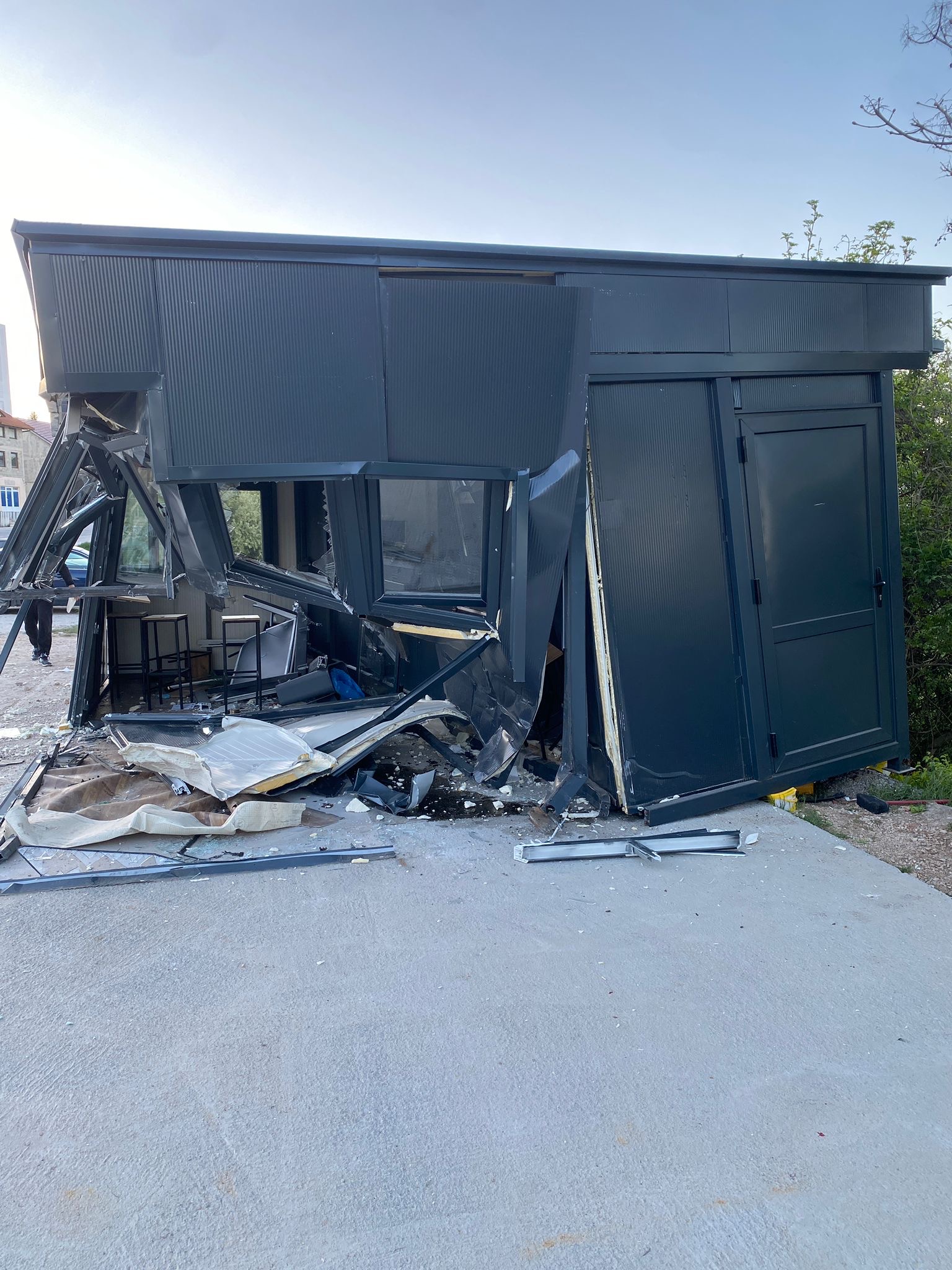 Na fotografiji s mjesta događaja vidi se potpuno uništena prednja strana objekta, razbijena stakla i velika šteta u unutrašnjosti.