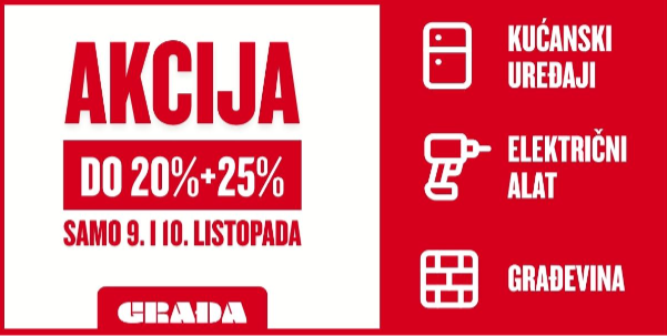 Samo 9. i 10. listopada očekuje vas velika akcija u Građa prodajnim centrima. Preko 500+ artikala kućanskih uređaja su na popustu od 20%+20% pa sve do 20%+25%.